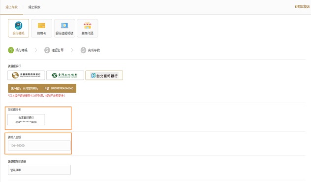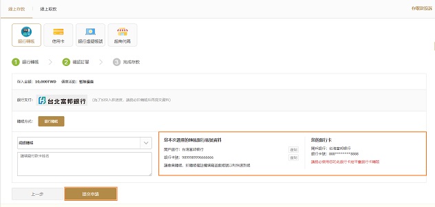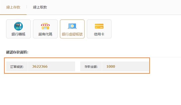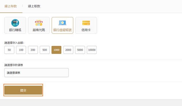 02選擇"銀行虛擬帳號"填寫存入金額、選擇存款優惠,點擊提交;