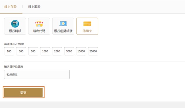 02選擇"信用卡"填寫存入金額、選擇存款優惠,點擊提交;