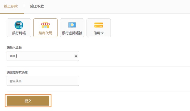 02選擇"超商代碼"填寫存入金額、選擇存款優惠,點擊提交;