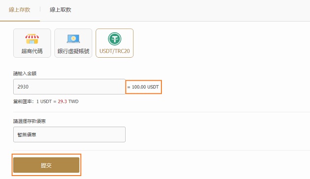 03選擇USDT協議,輸入存款金額,點擊"提交"